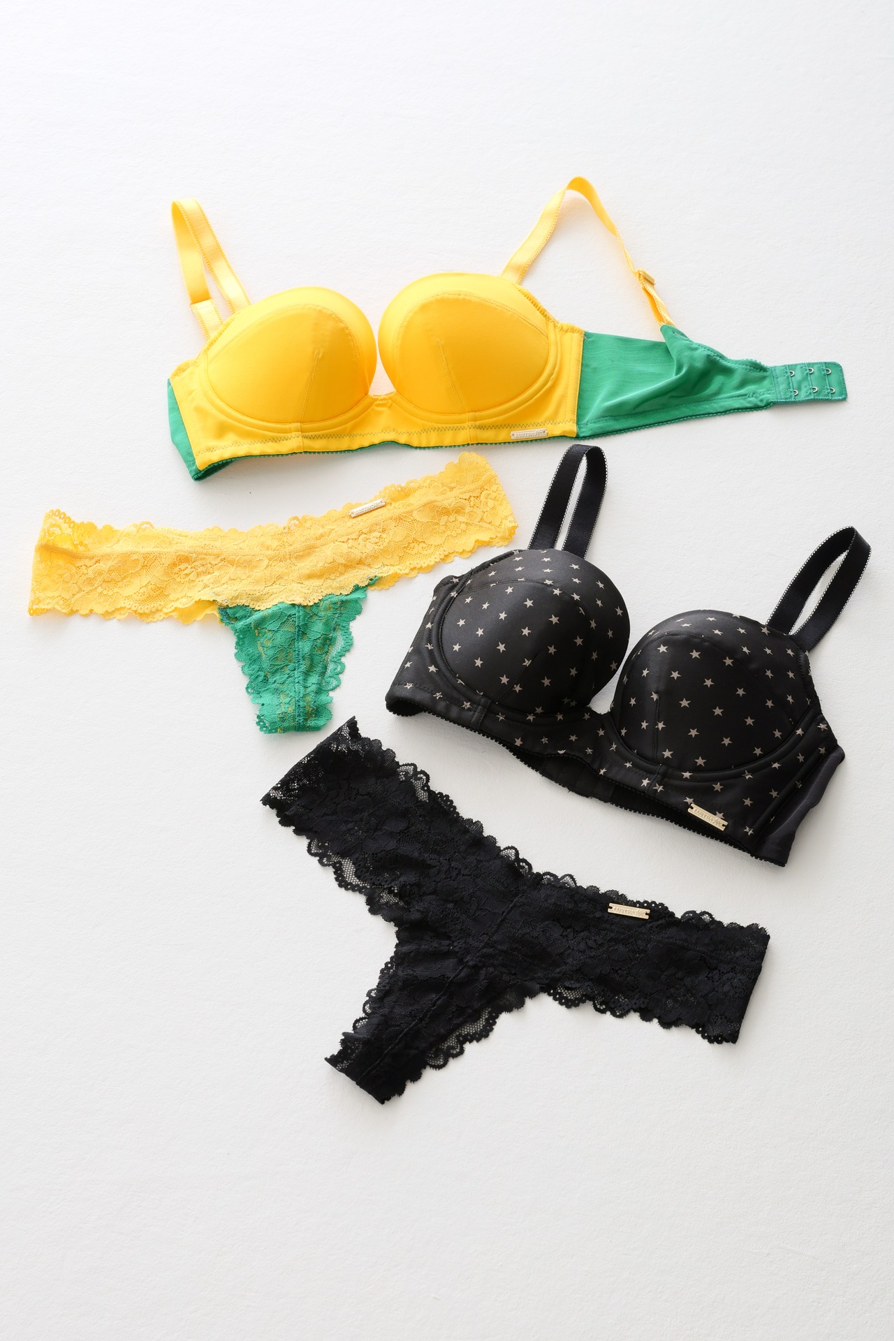 水着のように華やかなYELLOW×GREEN、大人デザインの中にキュートなSTAR×BLACK、デイリーユースなベージュの3色展開。
