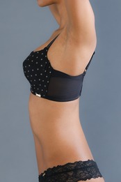 脇高のサイドベルトとサイドの丸みを削ったカップで、バスト全体、背中からも無理なくカップ内にカバーし、内向きに寄せ上げます。
